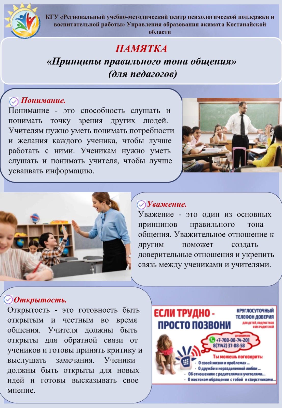 Кез келген адам кейде қиындықтарға тап болады. Сондай жағдайда сенім телефоны арқылы қолдау алуға болады. Сонымен қатар қандай қадамдар жасау керектігін шешуге жәрдем береді.Сенім телефоны кез келген адамға ашық. Қоңырау шалушының жасы, тұрғылықты жері, денсаулық жағдайы маңызды емес. Әркімнің қабылдауға, тыңдауға және көмек алуға құқығы бар.Адам өзін мазалаған кез келген мәселесін сенім телефонының кеңесшісімен бөлісе алады. Өйткені, әрбір жағдайда тәжірибе жеткілікті емес, бірақ шешім қабылдау керек.8 (7142) 37-08-58 – сенім телефоны; WhatsApp 77080874201 – қиын болса қоңырау шал. Сенім телефоны тәулік бойы, анонимді және тегін жұмыс істейді.