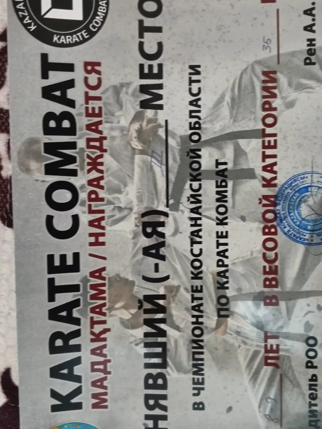 11.2025 проходил чемпионат Костанайской области по карате комбат, в котором ученик 3 б класса Альдикенов Расул занял 3 место в весовой категории 35 кг среди возрастной группы 8-9 лет.