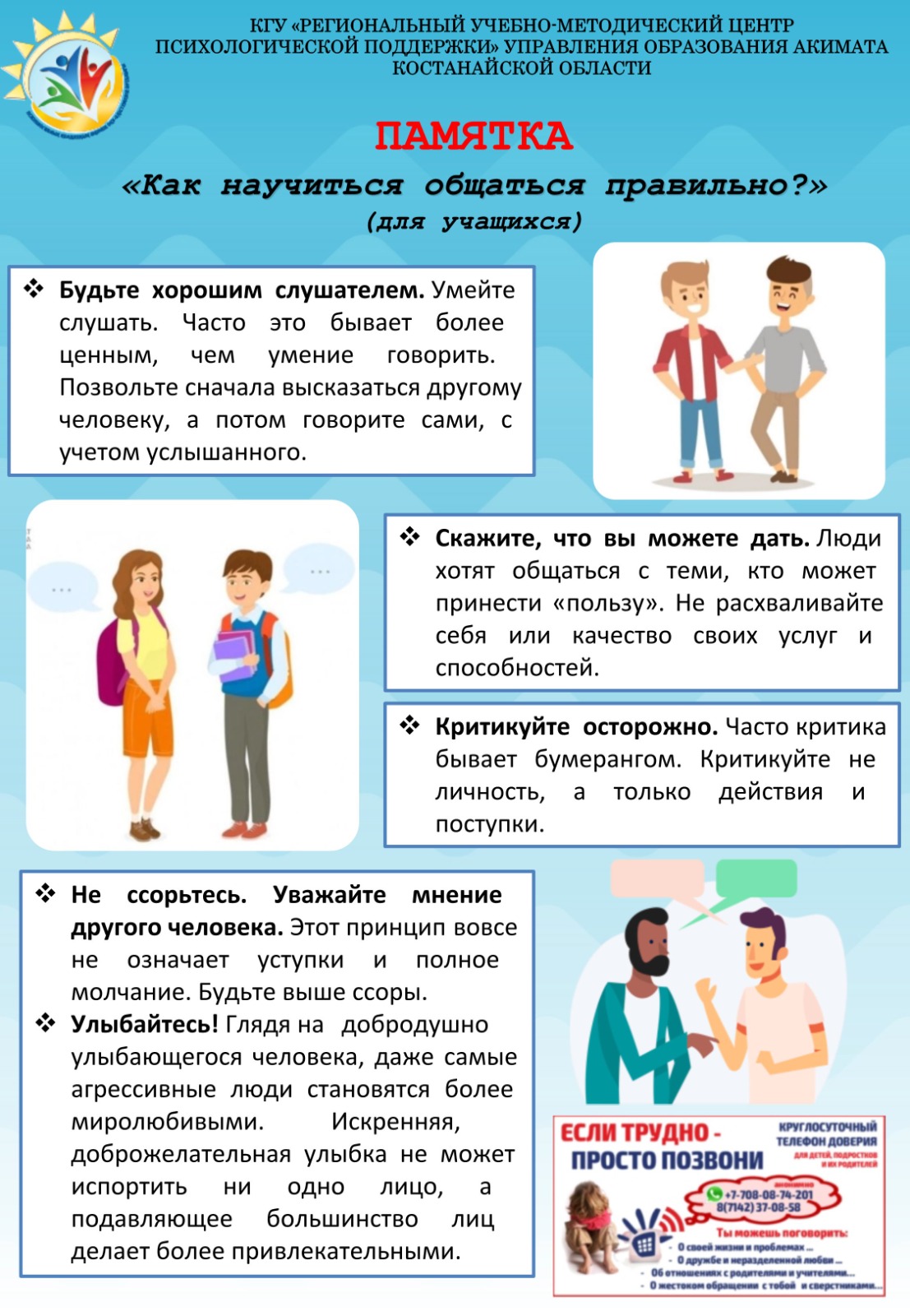 Кез келген адам кейде қиындықтарға тап болады. Сондай жағдайда сенім телефоны арқылы қолдау алуға болады. Сонымен қатар қандай қадамдар жасау керектігін шешуге жәрдем береді.Сенім телефоны кез келген адамға ашық. Қоңырау шалушының жасы, тұрғылықты жері, денсаулық жағдайы маңызды емес. Әркімнің қабылдауға, тыңдауға және көмек алуға құқығы бар.Адам өзін мазалаған кез келген мәселесін сенім телефонының кеңесшісімен бөлісе алады. Өйткені, әрбір жағдайда тәжірибе жеткілікті емес, бірақ шешім қабылдау керек.8 (7142) 37-08-58 – сенім телефоны; WhatsApp 77080874201 – қиын болса қоңырау шал. Сенім телефоны тәулік бойы, анонимді және тегін жұмыс істейді.