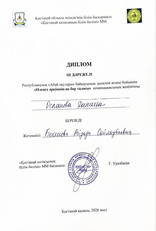 01.04.2026ж. «Абай оқулары» республикалық шығармашылық конкурсының қалалық кезеңінде 7-сынып оқушысы Оспанова Дания жүлделі 3-орынға ие болды. Жетекшісі — Бекенова Айзада Сайлаубаевна.